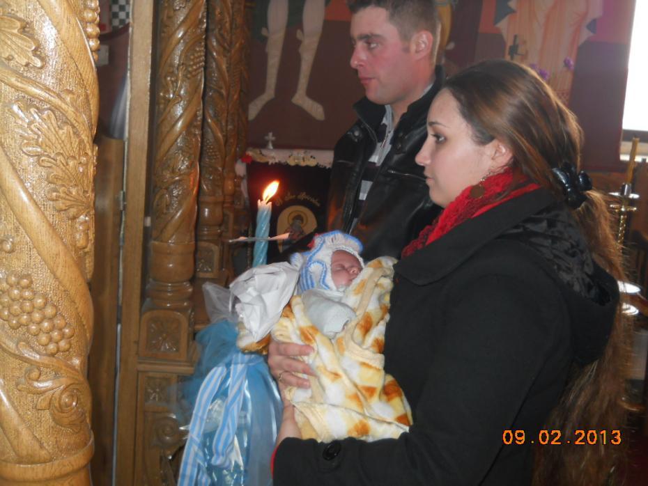 Naşii care au încreştinat copilaşul sunt tot din Movileni: Codrin-Constantin şi Petronela Grigoriu.